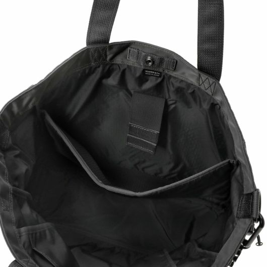 2WAYトートバッグ(L)は大容量のメイン収納部内に14inchのPCを収納できるクッション材入りのポケットを設けた、オン・オフどちらのシーンでも使いやすいアイテムです。ハンドルは肩掛けにも対応しています。サイドのポケットには600mlのペットボトルや折り畳み傘が収納できます。
