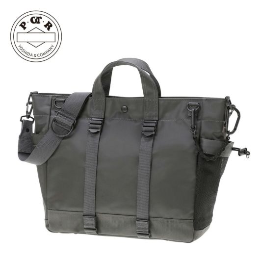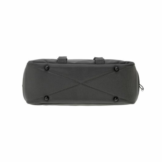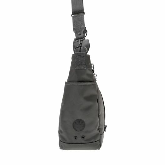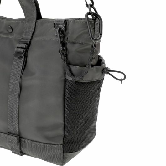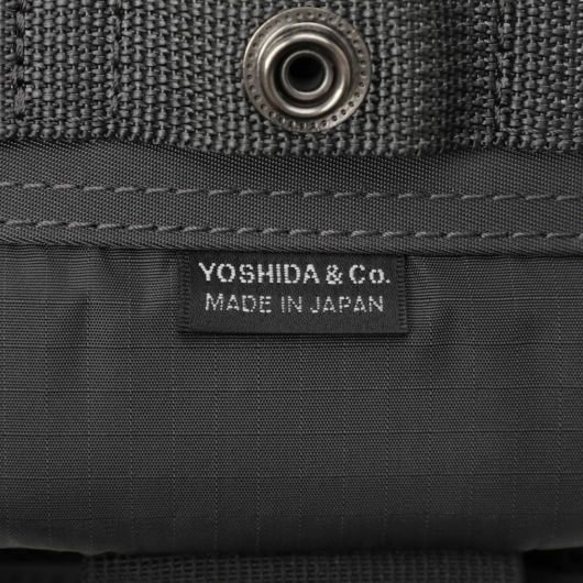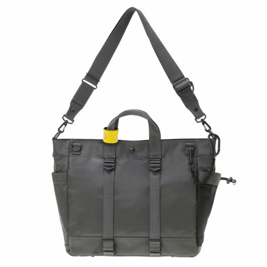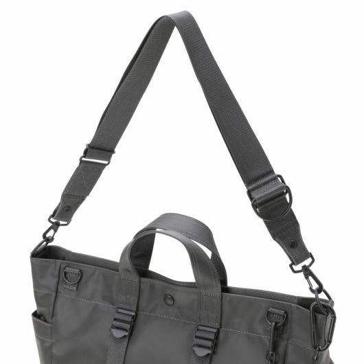 メイン素材にナイロンツイル生地を使用しており、PVC加工を施すことで耐水性を高めています。負荷のかかりやすい底マチ部分にはコーデュラバリスティックナイロンを採用し、耐久性も上げました。本体の前面や底面に身の回りのものを簡易的に固定して持ち運ぶことができるスリングバインダーも配しています。バックパックやウエストバッグはテープをクロスさせることで、見た目のアクセントにしました。ショルダーストラップはワンアクションで滑らかな調節が可能な画期的な仕様です。