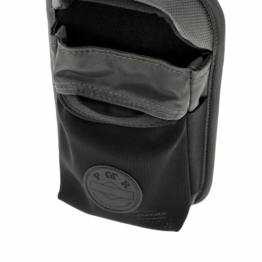 GPSホルダーはスマートフォンやアイウェアの収納に最適なアイテムです。内装に起毛素材を採用しているため、収納したアイテムの損傷を防ぎます。伸縮性のあるメッシュ生地を採用したフロントポケットは、ワイヤレスイヤホンなどの収納に適しています。また、背面に配したベルトでデイパックのストラップ部分などにアタッチメントが可能です。