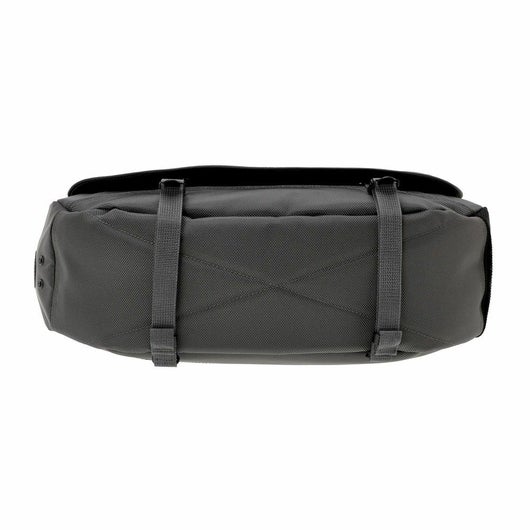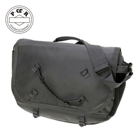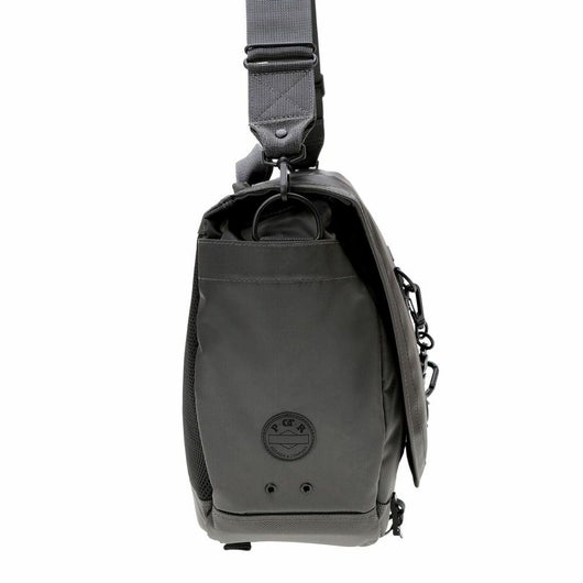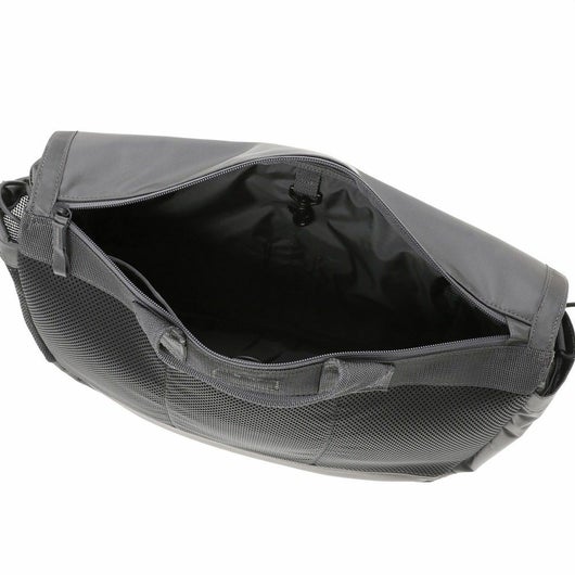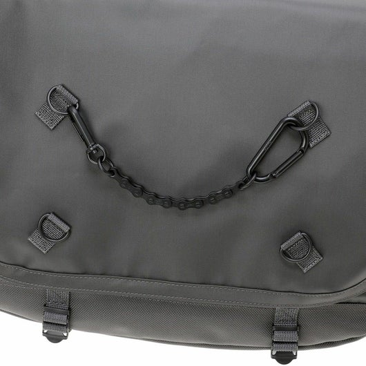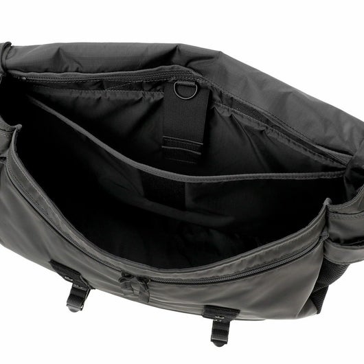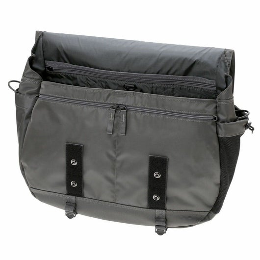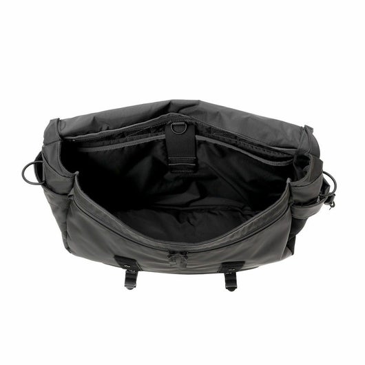 メッセンジャーバッグは大容量のメイン収納部と、内装に16inchのPCを収納できるクッション材入りのポケットを設けています。サイドポケットには600mlのペットボトルや折り畳み傘を収納することができます。背面側の上部にファスナーを設けることで内装に直接アクセスできる仕様で、フラップを開けなくてもPCや荷物を取り出すことが可能です。また、収納部の口元部分を金具で留めることができる仕様のため、型崩れしにくいのもポイントです。