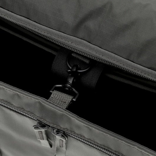 メイン素材にナイロンツイル生地を使用しており、PVC加工を施すことで耐水性を高めています。負荷のかかりやすい底マチ部分にはコーデュラバリスティックナイロンを採用し、耐久性も上げました。本体の前面や底面に身の回りのものを簡易的に固定して持ち運ぶことができるスリングバインダーも配しています。バックパックやウエストバッグはテープをクロスさせることで、見た目のアクセントにしました。ショルダーストラップはワンアクションで滑らかな調節が可能な画期的な仕様です。