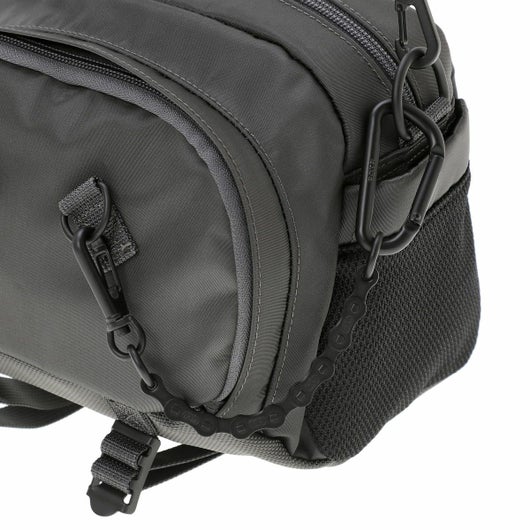メイン素材にナイロンツイル生地を使用しており、PVC加工を施すことで耐水性を高めています。負荷のかかりやすい底マチ部分にはコーデュラバリスティックナイロンを採用し、耐久性も上げました。本体の前面や底面に身の回りのものを簡易的に固定して持ち運ぶことができるスリングバインダーも配しています。バックパックやウエストバッグはテープをクロスさせることで、見た目のアクセントにしました。ショルダーストラップはワンアクションで滑らかな調節が可能な画期的な仕様です。