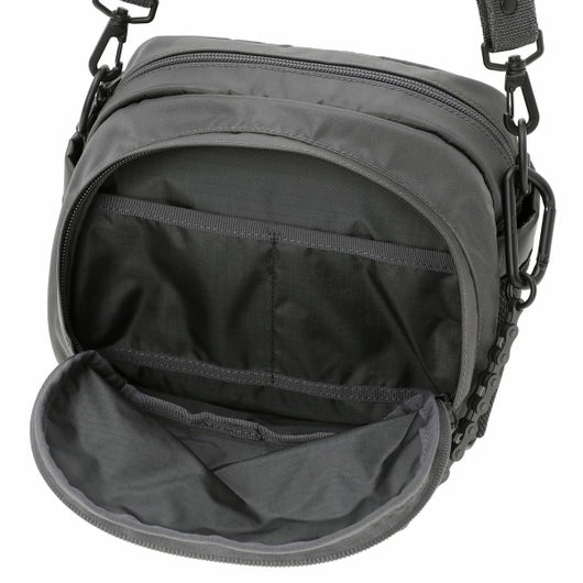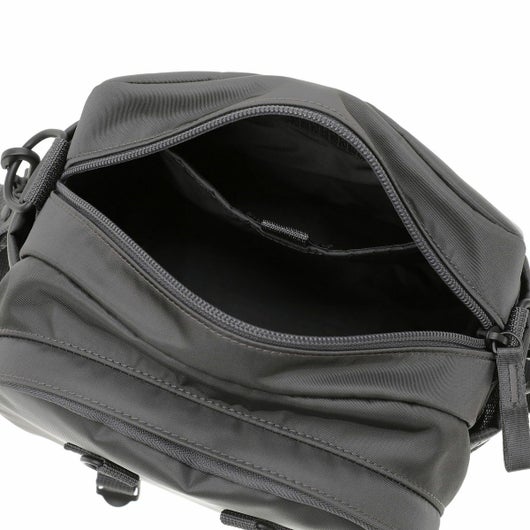ショルダーバッグは2層式で、小ぶりながらもマチ幅があり、身の回りの必需品や350mlのペットボトルが収納できるサイズで普段使いに最適なアイテムです。メイン収納部と前層の内装に小分けに便利なポケットを設けており、細かな荷物の収納が可能です。