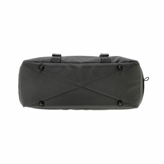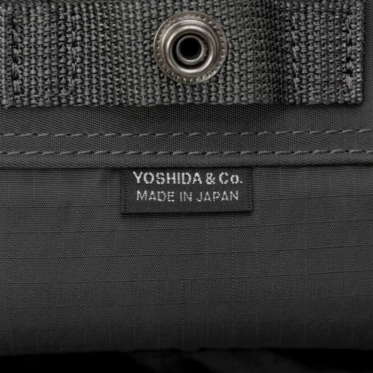 メイン素材にナイロンツイル生地を使用しており、PVC加工を施すことで耐水性を高めています。負荷のかかりやすい底マチ部分にはコーデュラバリスティックナイロンを採用し、耐久性も上げました。本体の前面や底面に身の回りのものを簡易的に固定して持ち運ぶことができるスリングバインダーも配しています。バックパックやウエストバッグはテープをクロスさせることで、見た目のアクセントにしました。ショルダーストラップはワンアクションで滑らかな調節が可能な画期的な仕様です。