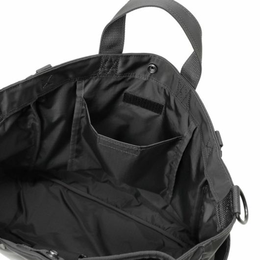 2WAYトートバッグはA4の書類が収納できるサイズで、内装に13inchのPCを収納できるクッション材入りのポケットを設けています。サイドポケットには600mlのペットボトルや折り畳み傘が収納可能です。