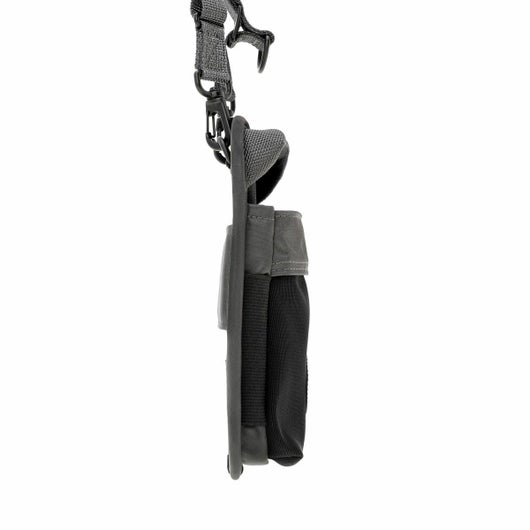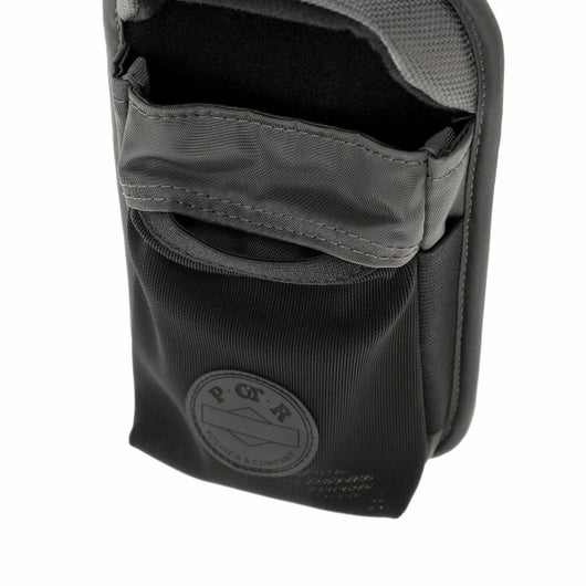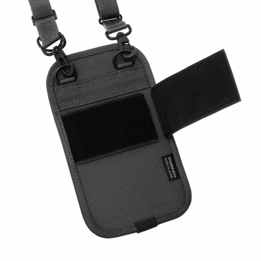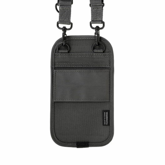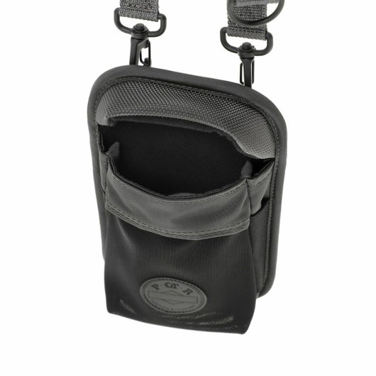 GPSホルダーはスマートフォンやアイウェアの収納に最適なアイテムです。内装に起毛素材を採用しているため、収納したアイテムの損傷を防ぎます。伸縮性のあるメッシュ生地を採用したフロントポケットは、ワイヤレスイヤホンなどの収納に適しています。また、背面に配したベルトでデイパックのストラップ部分などにアタッチメントが可能です。