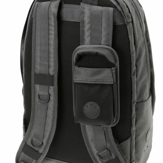 メイン素材にナイロンツイル生地を使用しており、PVC加工を施すことで耐水性を高めています。負荷のかかりやすい底マチ部分にはコーデュラバリスティックナイロンを採用し、耐久性も上げました。本体の前面や底面に身の回りのものを簡易的に固定して持ち運ぶことができるスリングバインダーも配しています。バックパックやウエストバッグはテープをクロスさせることで、見た目のアクセントにしました。ショルダーストラップはワンアクションで滑らかな調節が可能な画期的な仕様です。
