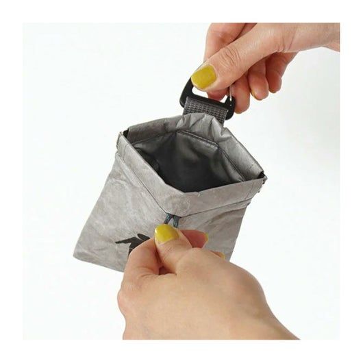 口元はばね口仕様で片手で簡単に開けられます。また、口元のループとカラビナを持って開閉することも可能です。パカっと閉じて中のゴミが出てしまう心配もありません。内側にはふき取ることができる素材を使用しています。