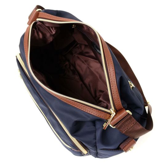「シンプル・フェミニン・ファンクション」をテーマに、お洒落なモード系のデザインと使いやすい機能で、大人の女性を中心に人気を集めています。光沢感のあるナイロンに、ナチュラルなシボ感のあるフェイクレザーを使用。3か所外ポケットがあり、機能性があります。
