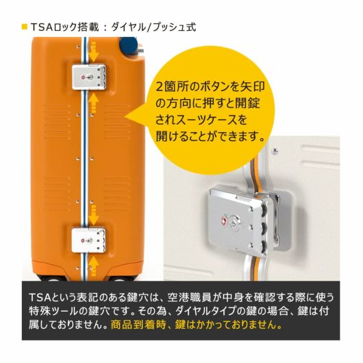 TSAロック(TSロック)|アメリカ(ハワイ等含む)渡航の際、TSA公認の製品に限り鍵をかけて預ける事ができます。この製品のTSAロックは米国連邦航空省運輸保安局が認定しTRAVELSENTRY社が管理・運営しているシステムです。