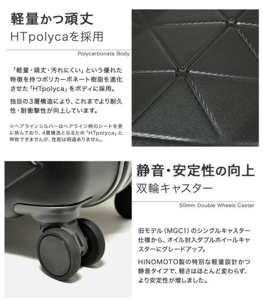 信頼のサンコー鞄品質。超軽量フラッグシップモデル「SUPER LIGHTS MGC|極軽」が、多くの再販ご要望により待望のリニューアル。キャスターがダブルホイール仕様になり、軽さはほとんど変わらず、より安定性が増しました。