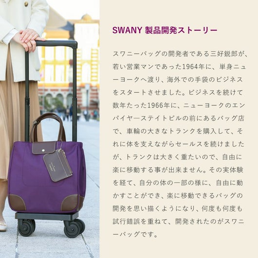 SWANY×トランジットラウンジコラボ企画。前面部の合皮のフラップポケットと配色ステッチがデザインポイント。コロンとした可愛らしいフォルムですが脇部分のホックを外すとトート型としてもお使いいただけます。タウンにもお出かけにもお使いいただけるシリーズです。