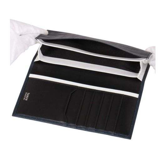 シェパードチェックがポイントのソフトタイプの薄サイフシリーズ。2回に分けて異なる柄の型押しを施し角度によりシェパードチェック柄が見え隠れするように仕上げています、2度の型押しを経てもなお、ソフトな風合いを残している点が魅力です。風琴マチを取り入れ無駄な厚みを無くした造りを採用。