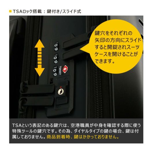 TSAロック|アメリカ(ハワイ等含む)渡航の際、TSA公認の製品に限り鍵をかけて預ける事ができます。この製品のTSAロックは米国連邦航空省運輸保安局が認定しTRAVELSENTRY社が管理・運営しているシステムです。