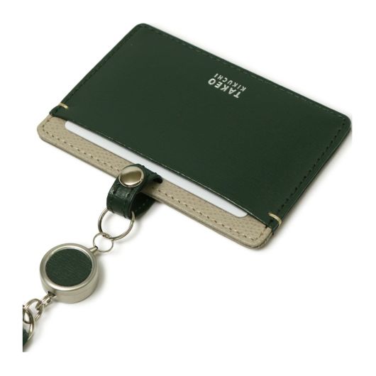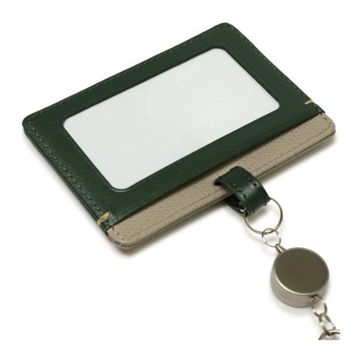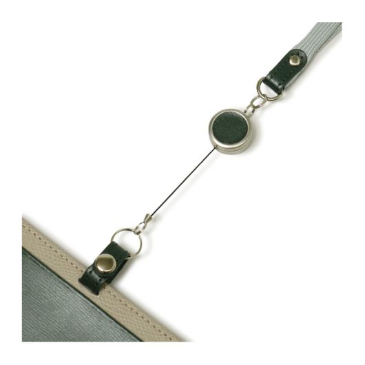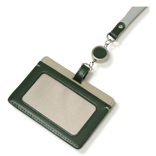 伸縮リールがついた使い勝手のいいIDケース。首にかける紐には革を使用せず、首あたりのやさしいポリエステル素材を使用しています。
