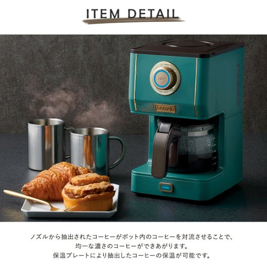 「間欠抽出」でハンドドリップのように、コーヒー粉をじっくり蒸らしながら淹れられるコーヒーメーカー。ノズルから抽出されたコーヒーがポット内のコーヒーを対流させることで、均一な濃さのコーヒーができあがります。1度に5杯分のコーヒーが淹れることが可能で、保温プレートにより抽出したコーヒーの保温が可能です。メッシュフィルターとガラスポットは水洗いOK。