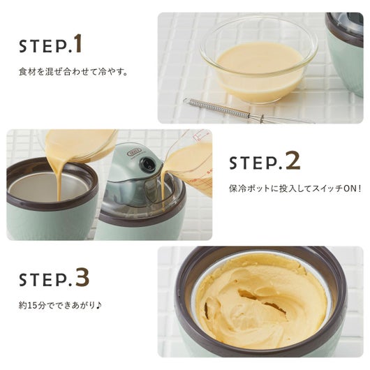 保冷ポットを冷凍庫で冷やした後は、材料を入れてスイッチを入れるだけで簡単にアイスが作れます。ふたの食材投入口から食材を追加できるからアレンジだって簡単♪約15分で自家製アイスクリームのできあがり♪生クリームを手で泡立てる手間も必要ありません。カンタンレシピ付き。