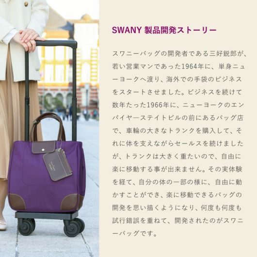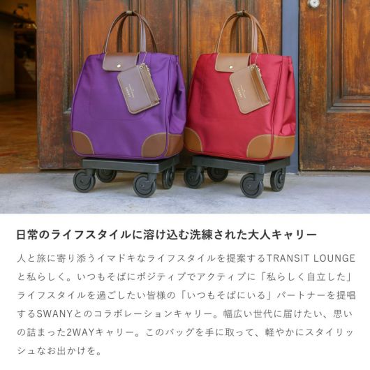 SWANY×トランジットラウンジコラボ企画。前面部の合皮のフラップポケットと配色ステッチがデザインポイント。コロンとした可愛らしいフォルムですが脇部分のホックを外すとトート型としてもお使いいただけます。タウンにもお出かけにもお使いいただけるシリーズです。