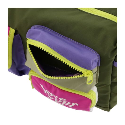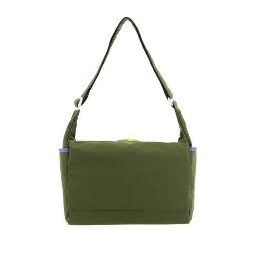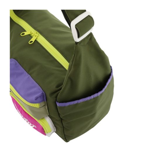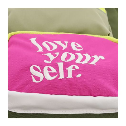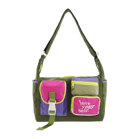 大胆なカラーコンビネーションと「love your self.」の刺繍メッセージがポイントのショルダーバッグ。