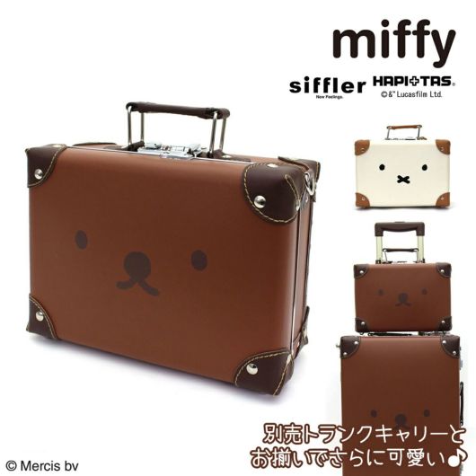 ミッフィーとボリスのかわいいフェイスのミニトランク。合成皮革で作られておりクラシカルでおしゃれな雰囲気。普段のお出かけにも旅行に持って行っても可愛い!内装のファスナートップはキャラクターの形で、細部までこだわった作りです。ショルダーベルトもついているので、肩掛けや斜め掛けもできます。別売りのトランクキャリー(HAP3110)とお揃いで使っても可愛い!