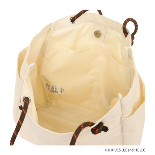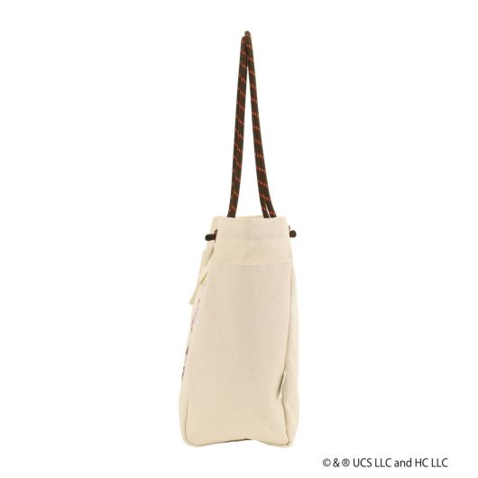 前面にジョージの刺繍とプリントデザイン、とってもカラフルな可愛いバッグとなっております。背面にもプリントデザイン。缶バッチ付き。コードハンドルハトメデザイン。