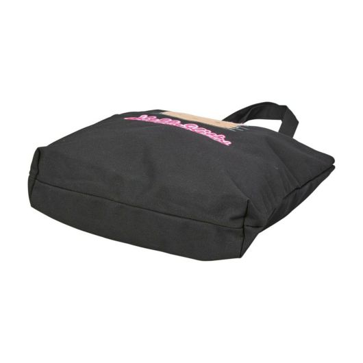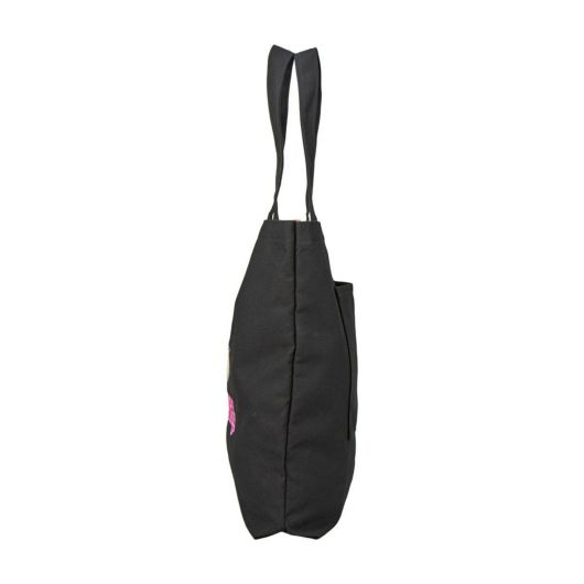 日焼けデザインのハローキティのトートバッグ。日焼けデザインのハローキティがピンクのヒョウ柄リボンをつけたお顔の刺繍がかわいい。トートバッグのブラックの生地に映えるピンクのロゴも大人かわいいデザインです。内装はヒョウ柄でかわいいが詰まったトートバッグです。