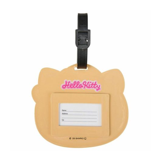 日焼けデザインのハローキティのお顔のダイカットラゲッジタグ。日焼けデザインのハローキティがピンクのヒョウ柄リボンをつけたお顔がかわいい。