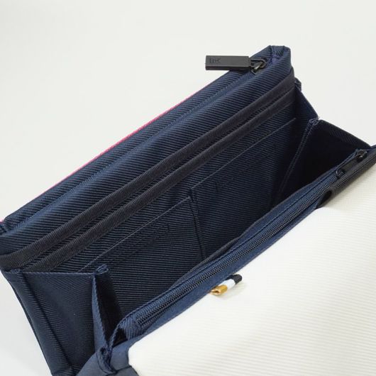 マグネットタイプでスムーズに開閉できるフラップを開けると、中には細かく仕切られたポケットが出現。