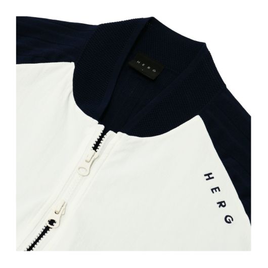 伸縮性がよく、ハリのある編地のニット製のバックデザインと、撥水加工のストレッチナイロンの異素材コンビブルゾン。適度なハリ感が大人のウェアにしてくれています。