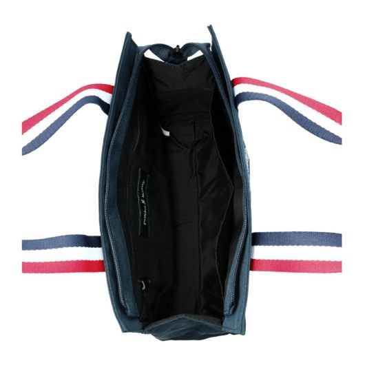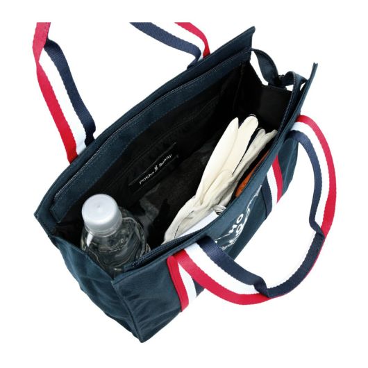 厚めのポリエステル生地を使用したシンプルなラウンドトートです。丸型のバニーマークとトリコロールテープが特徴的なデザインです。マチが細めでありながら、外側に1つ、内側に1つのポケットがあり、小物の収納に便利です。使い勝手の良さを重視したコンパクトなサイズで、日常使いから旅行まで幅広く活躍します。