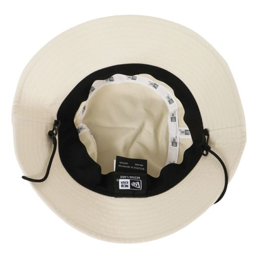 ニューエラとのコラボ商品、コットンツイル生地のアドベンチャーハットです。軽量化と着用時の通気性向上のために、ライニングを取り除いています。刺繍仕様のアイレットと着脱可能なあご紐が特徴です。