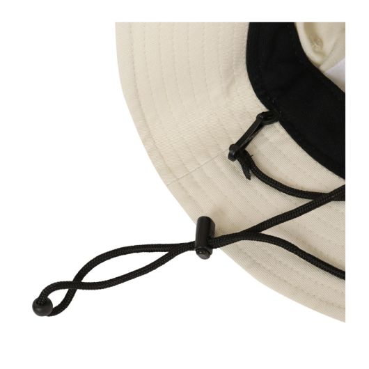 ニューエラとのコラボ商品、コットンツイル生地のアドベンチャーハットです。軽量化と着用時の通気性向上のために、ライニングを取り除いています。刺繍仕様のアイレットと着脱可能なあご紐が特徴です。