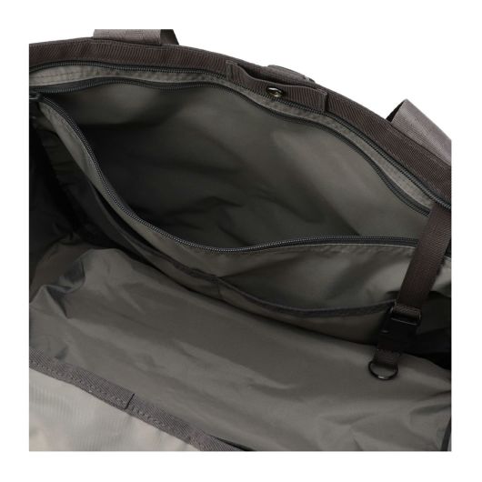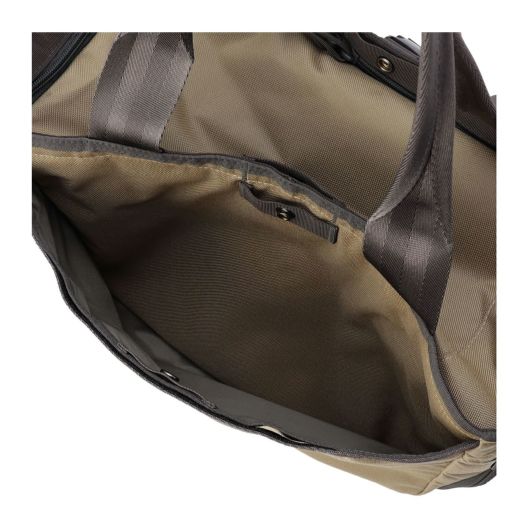 また、開口部センターにはスナップボタンを配し、荷物が少ないときなどはスナップボタンを留めることでマチ幅を調節することが可能。