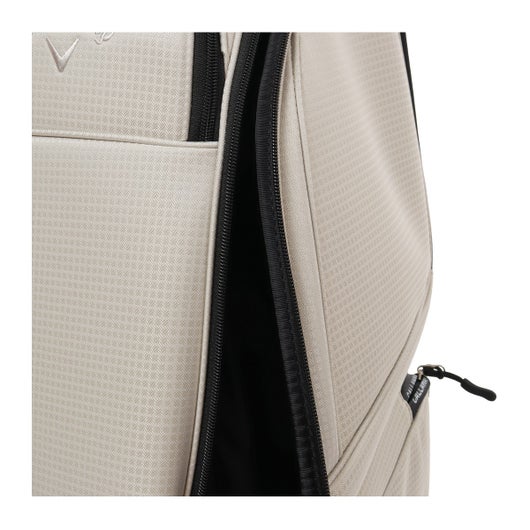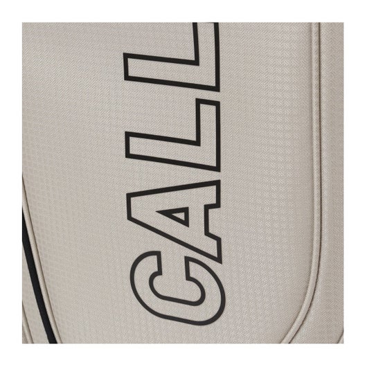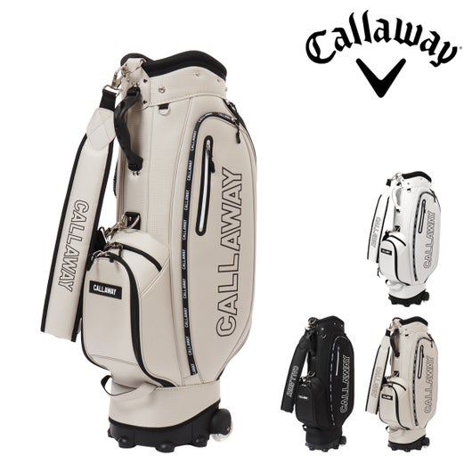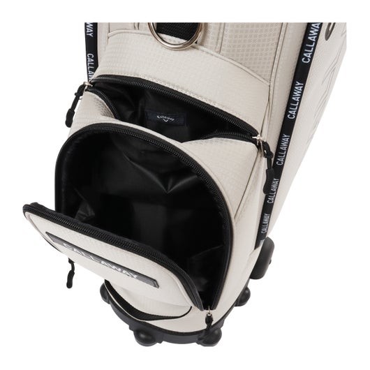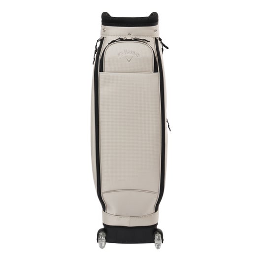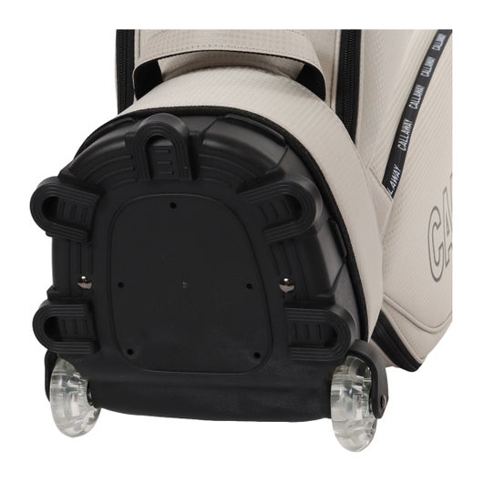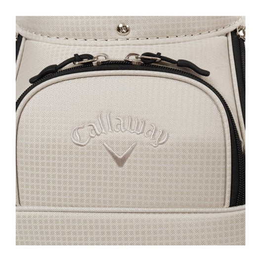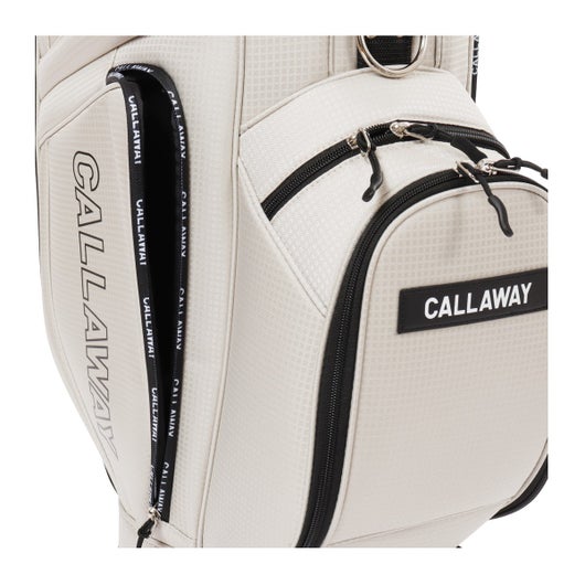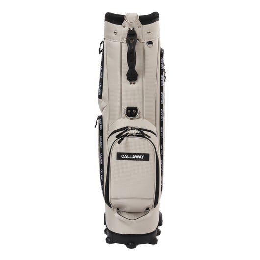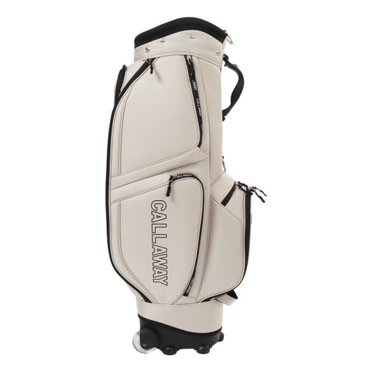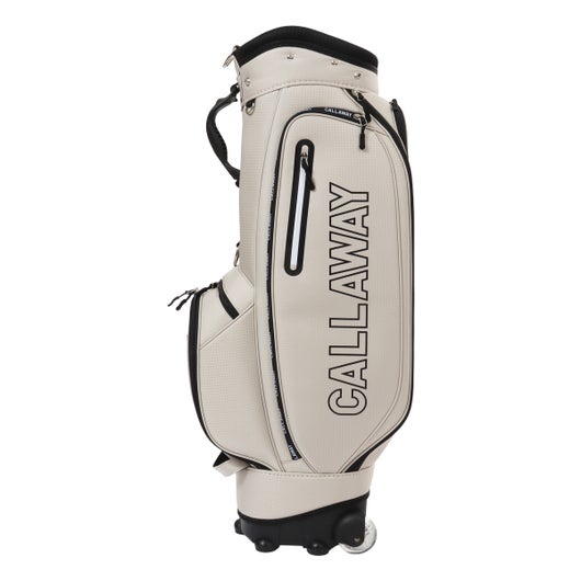 ボトムのキャスターと背面に収納されたハンドルを伸ばして使うことで、スムースな移動を実現可能。 生地は軽量のポリエステルを使用。シンプルな配色とサイドパネルに大きくプリントされたCALLAWAYの横文字がスポーティーでカジュアルな印象を演出。 CALLAWAYの文字をプリントしたファスナーもデザインのアクセントとなっています。口枠は8.5型を採用し、5分割仕様。ポケットは合計7個。正面にダース箱も入るポケットとスモールポケット。右サイドは大きなサイドポケットとスモールポケット。左サイドは上下にセパレートされたミドルサイズのポケットを配置。 ※背面ポケットは、ハンドルが格納されているため、収納スペースは狭くなっています。