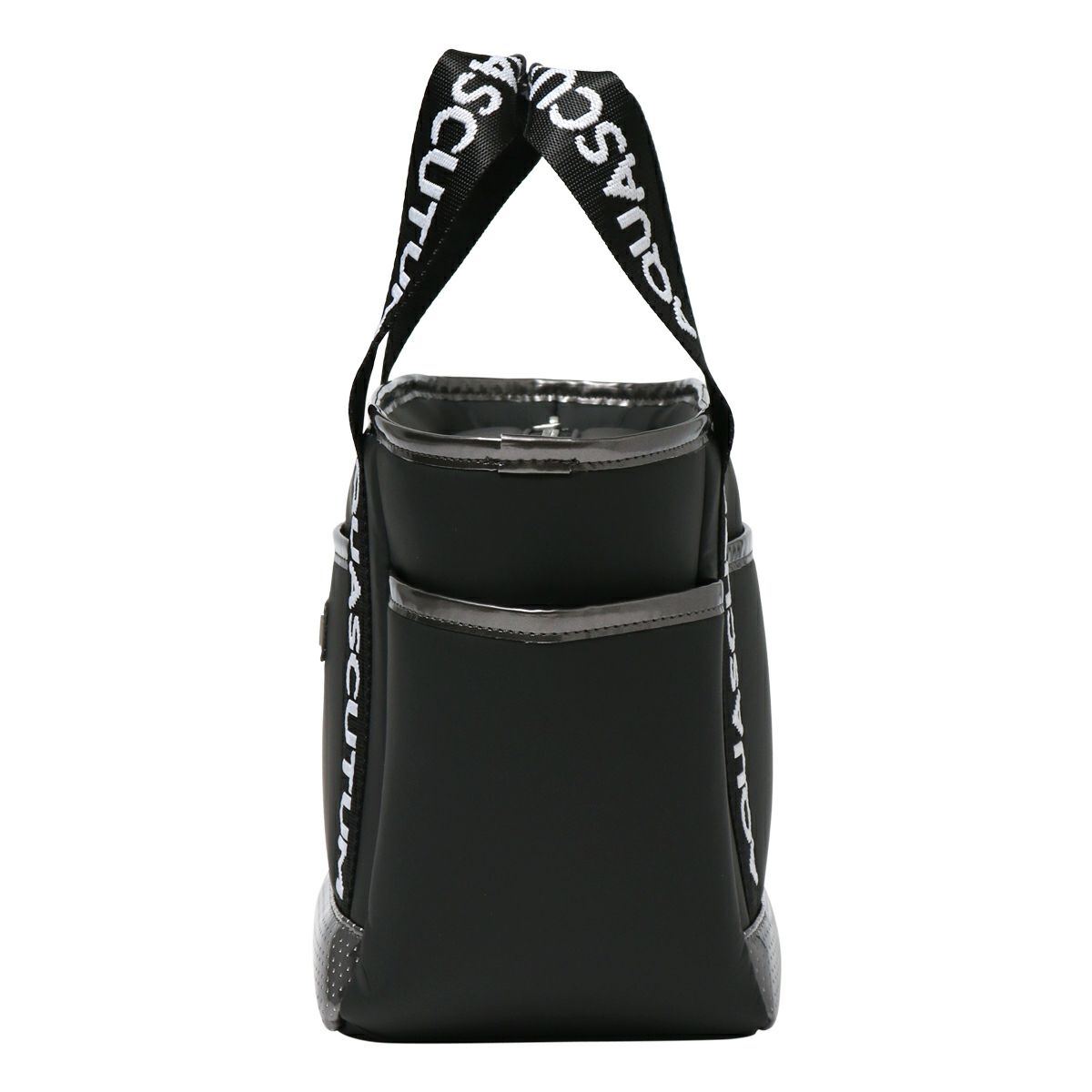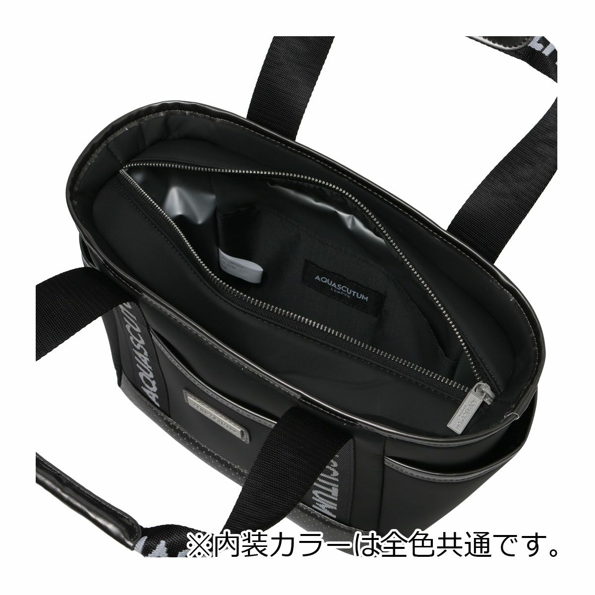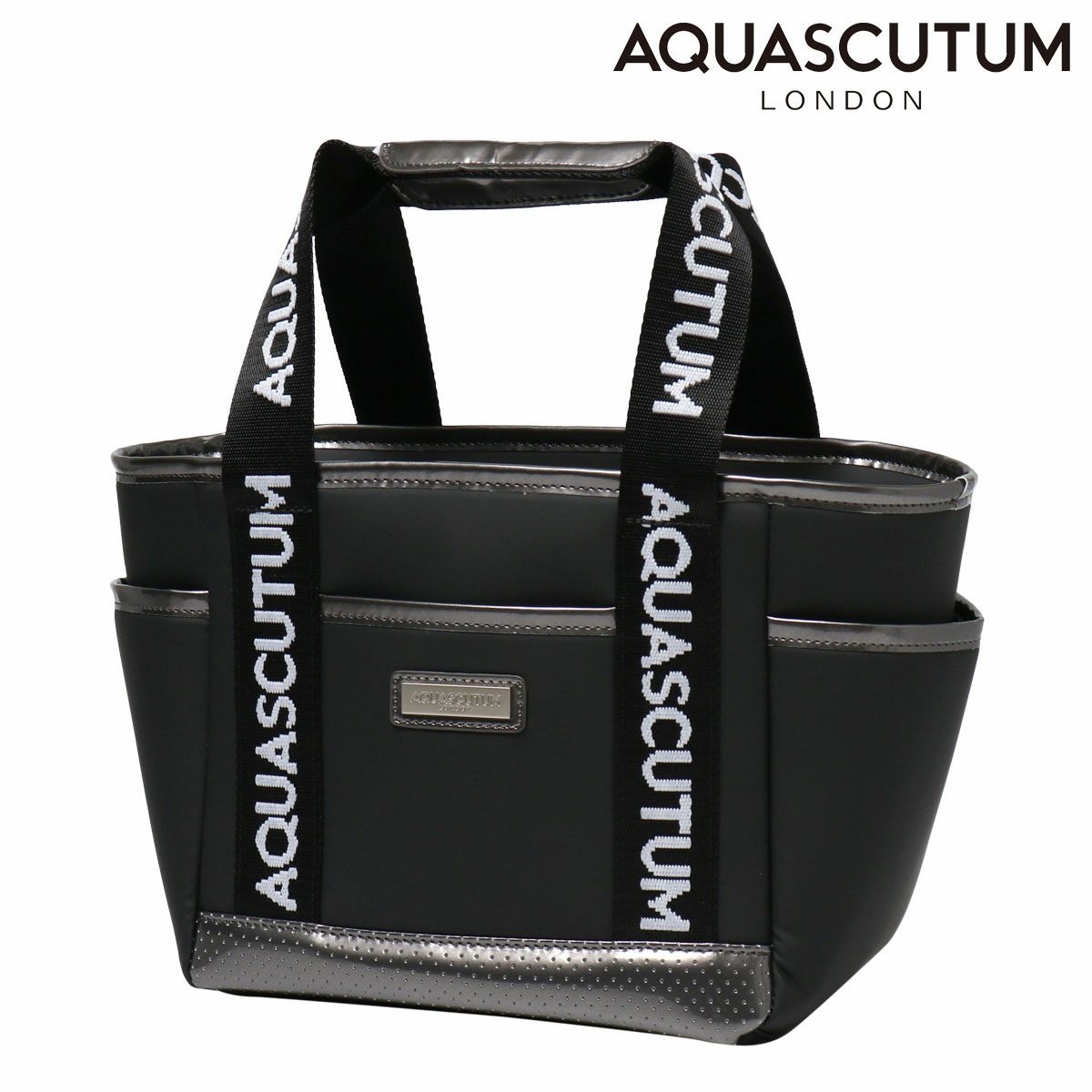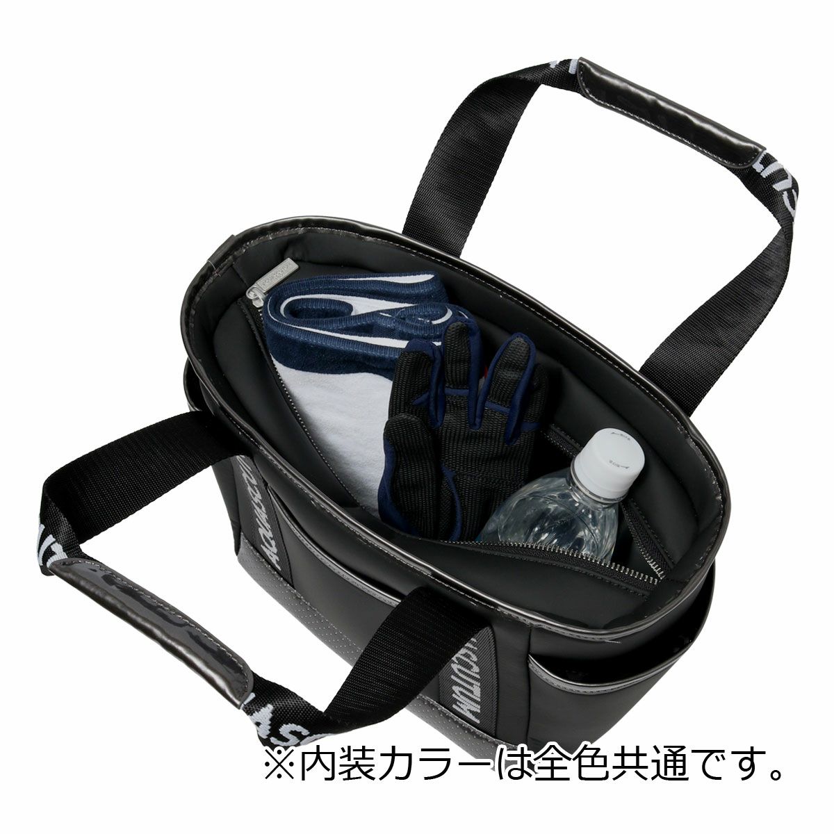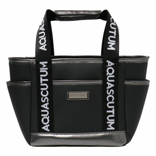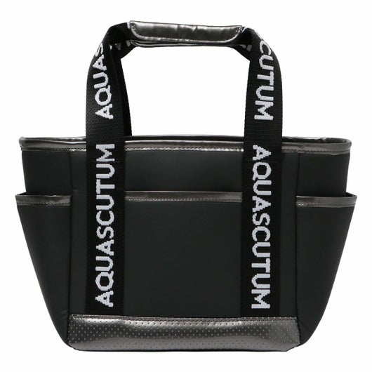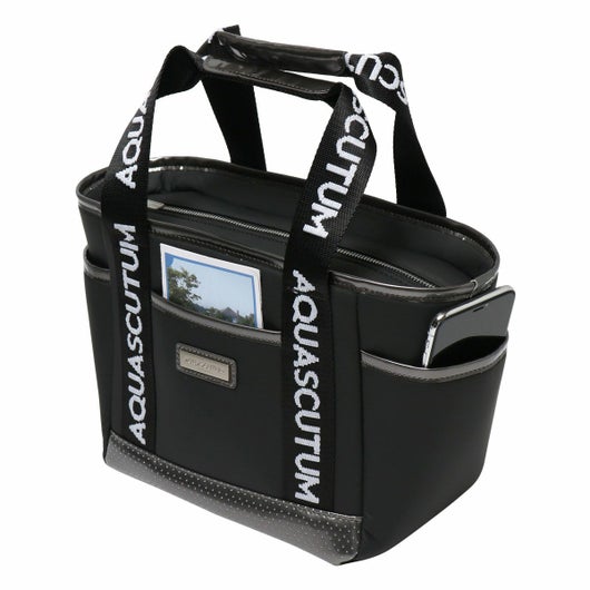 ロゴジャガードテープの持ち手、メタルプレート付。保冷、防滴裏地仕様。内外に多機能ポケット付き。