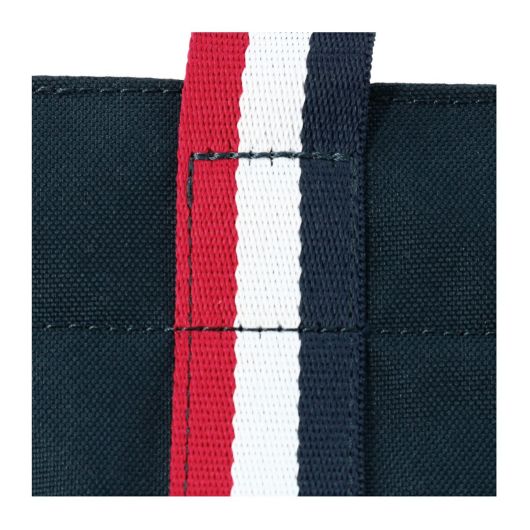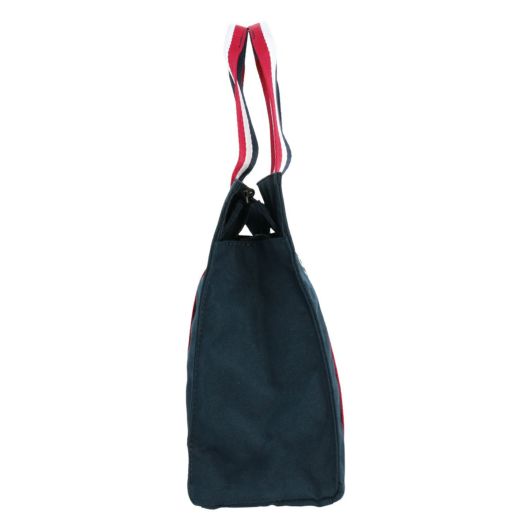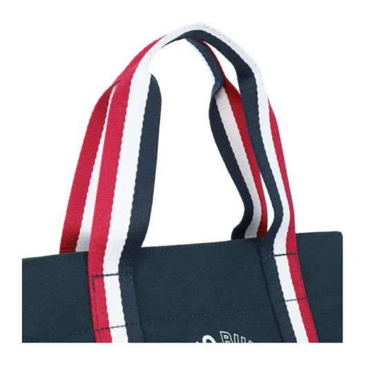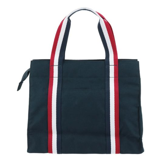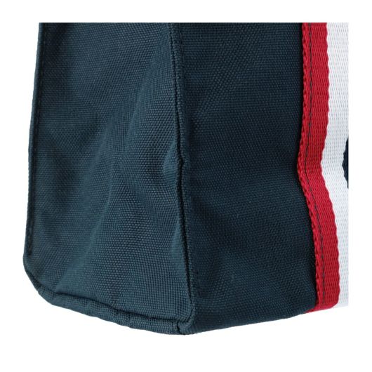 厚めのポリエステル生地を使用したシンプルなラウンドトートです。丸型のバニーマークとトリコロールテープが特徴的なデザインです。マチが細めでありながら、外側に1つ、内側に1つのポケットがあり、小物の収納に便利です。使い勝手の良さを重視したコンパクトなサイズで、日常使いから旅行まで幅広く活躍します。