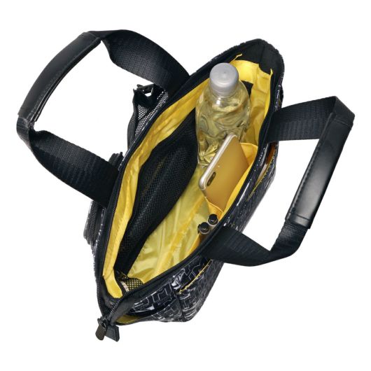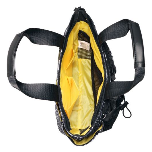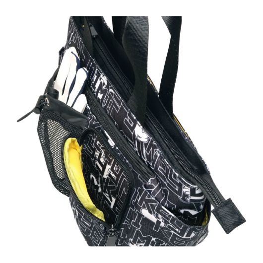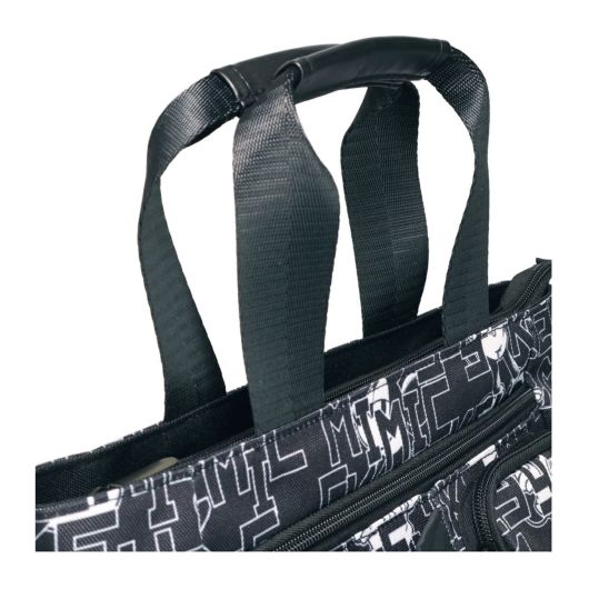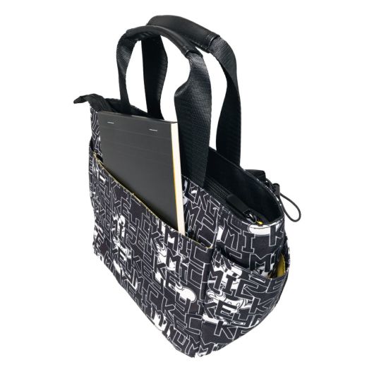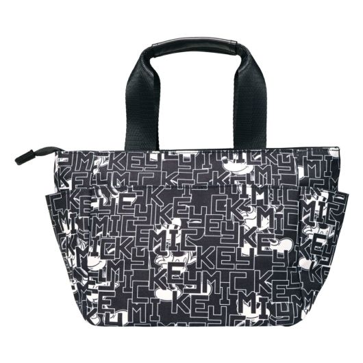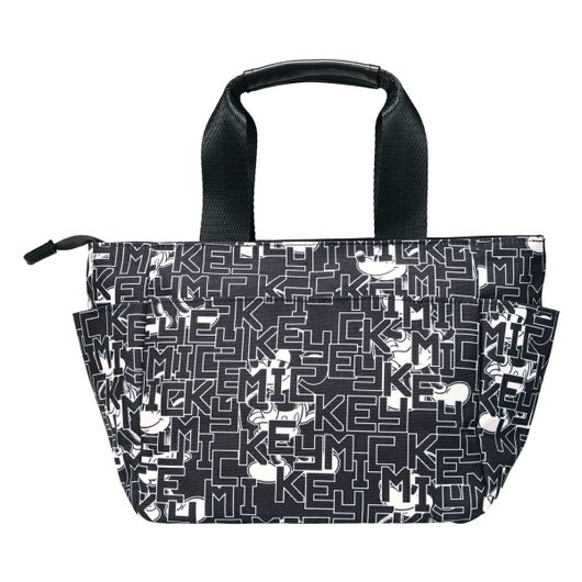 ミッキーとロゴをモノトーンカラーでアレンジしたラウンドトートです。間口が大きく、荷物の出し入れがしやすい設計です。内側と外側に多数のポケットがあり、収納力に優れています(外側6ポケット、内側3ポケット)。ハンドル上部は合皮巻きで、持ちやすいデザインになっています。