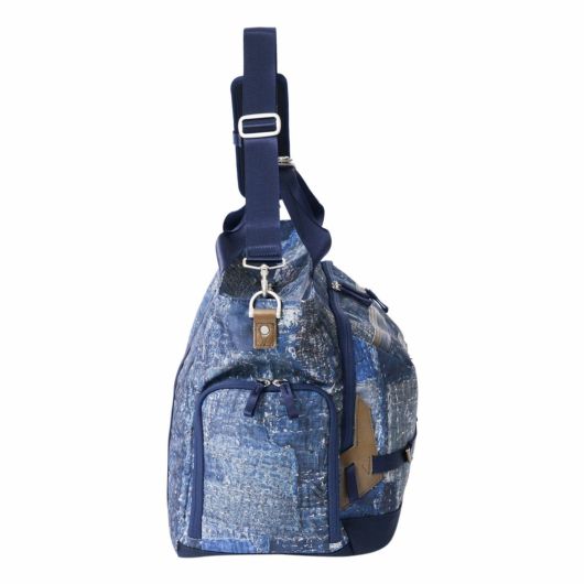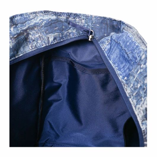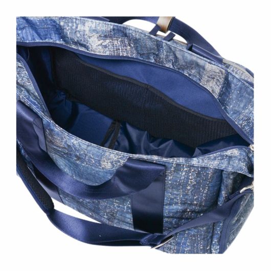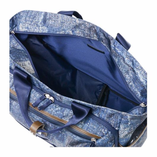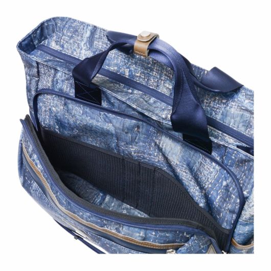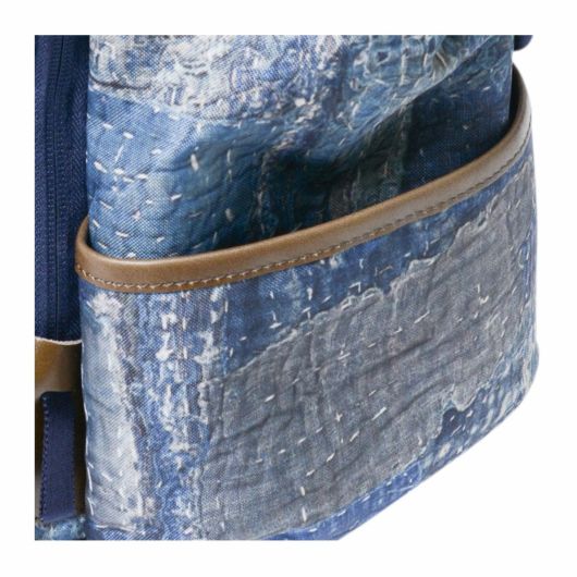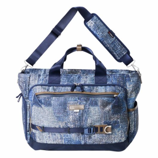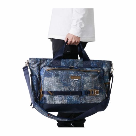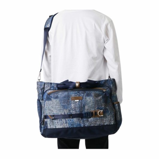 本体素材は600dのポリエステル糸を高密度に織ったオックスに、エイジングインディゴデニム柄、日本の伝統的な刺し子デザインやボロパッチワークといったFDMTL(ファンダメンタル)の美学を備えたテクニカル生地で構築したオリジナルの柄を、昇華転写プリントで表現しています。付属素材もレザーは防水鞣しを施したレザーを使用、底面の素材は、通常ナイロンの約5倍の摩耗・引き裂き強度・耐久性を持つINVISTA社の1680DコーデュラバリステックRナイロンを使用し、裏面にPVC加工を施すことで更なる強度と防水性を向上させています。