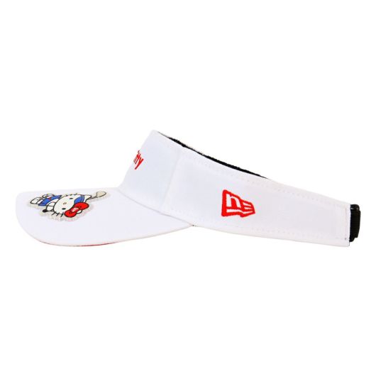 ハローキティとのコラボレーションコレクション。本コラボレーションのために描き起こされたニューエラキャップをかぶったハローキティ、ハローキティのアイコンでもあるリボンやりんごモチーフとニューエラロゴを組み合わせたデザインなど、コラボレーションならではのデザイン。バイザーを通常より10mm長い仕様にアレンジしたサンバイザー。日光の遮蔽効果に優れています。リアのベルクロストラップで頭回り約52cmから55.8cmまでサイズ調整が可能です。