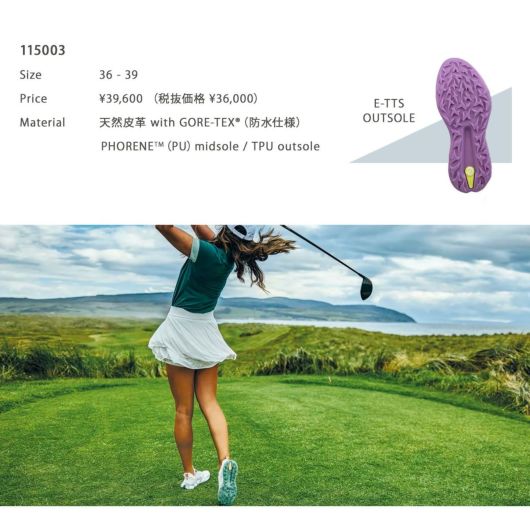 備考 |※本シューズはゴルフ場の芝上でのグリップ力を最大限発揮するよう開発されたソール形状のため、練習場(打ちっぱなしなど)のラバーマット及び人工芝の上でお使いいただきますと、破損の原因になります。