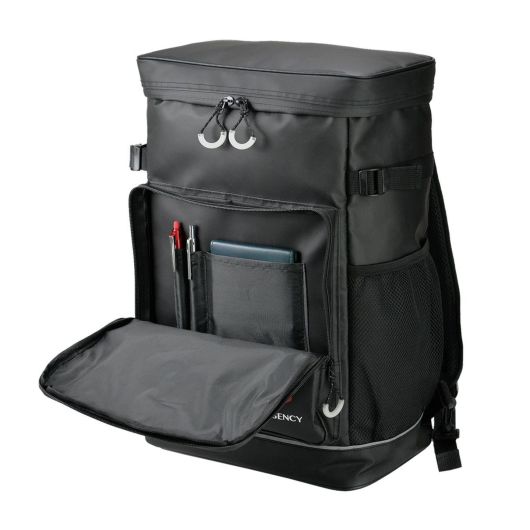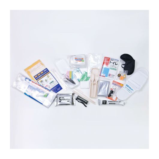 災害に備える、防水・反射材付きの非常持ち出しリュック。15点の防災アイテムがセットになっています。