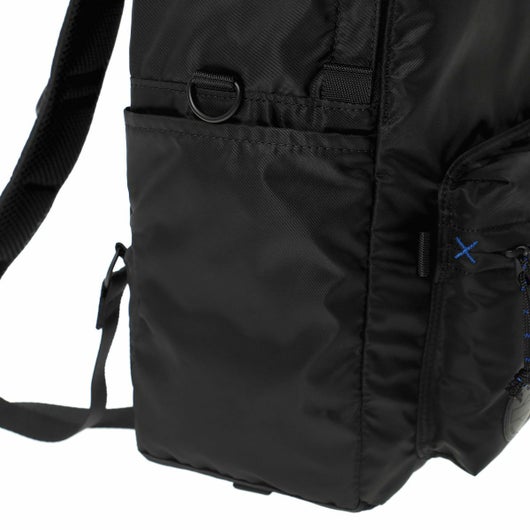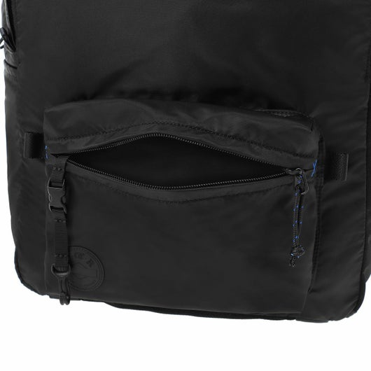 メイン素材は撥水・防汚効果のあるテフロン加工を施した軽量なナイロンツイルを使用しており、旅先の急な雨でも安心して使うことができます。内装には視認性の良い鮮やかなマリンブルーカラーの生地を採用しました。同色の補強ステッチをドローコードや前ポケットに施し、デザインのアクセントにしています。