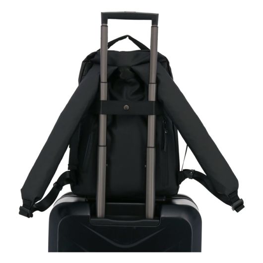 背胴には長財布などを収納できるファスナーポケット、スマホなどを収納できる小ぶりなオープンポケットが付いています。また、キャリーケースのバーにセットアップできるようナイロンテープも付けています。