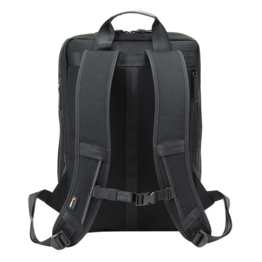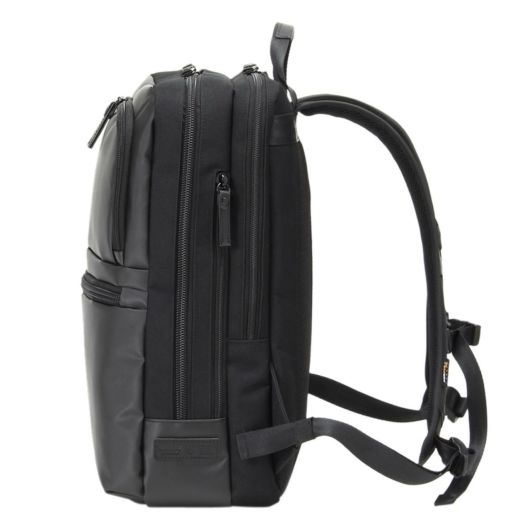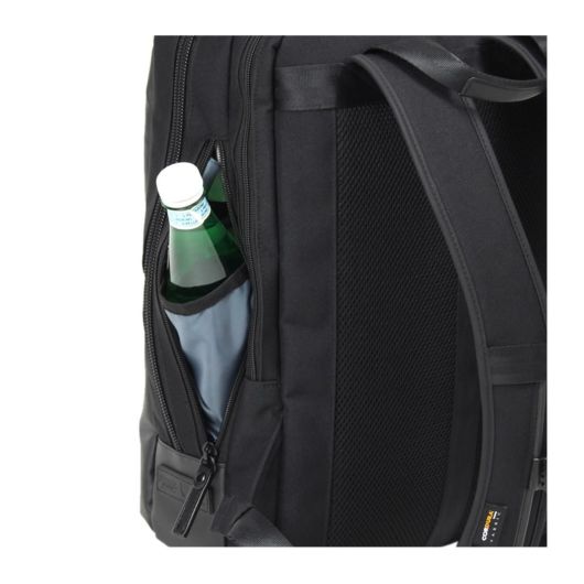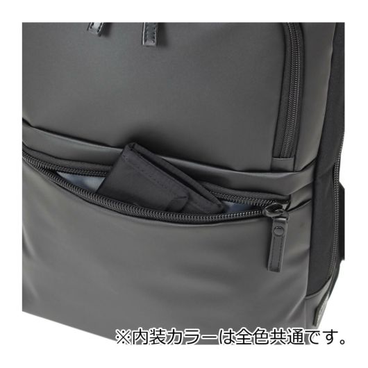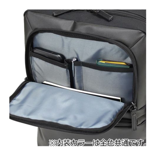 小物収納に便利な前ポケット、メインルーム、背面モバイル収納と別れておりメインルームにはビジネスツール収納がしやすいメッシュポケットや小物ポケットがついています。背面にはPCなどのデジタル機器のためのクッションポケットを備えています。背面側には貴重品などの収納に便利なポケット、サイドのファスナーからボトルを収納でき内部とつながっています。