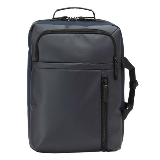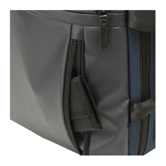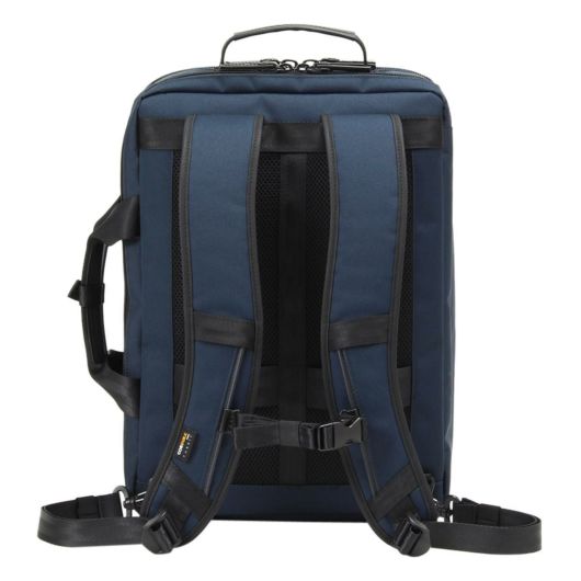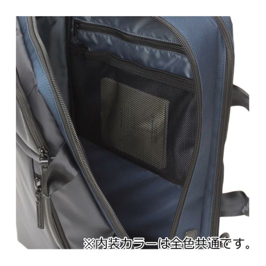 小物収納に便利な前ポケット、メインルーム、背面モバイル収納と別れておりメインルームにはビジネスツール収納がしやすいメッシュポケットや小物ポケットがついています。メインルームは大きくL字に開き中身がひと目で分かります。縦持ち、横持ちにしても収納物がバラバラにならないように各部の小物ポケットにはマジックテープ、ファスナーポケット対応となっています。背面にはPCなどのデジタル機器のためのクッションポケットを備えています。