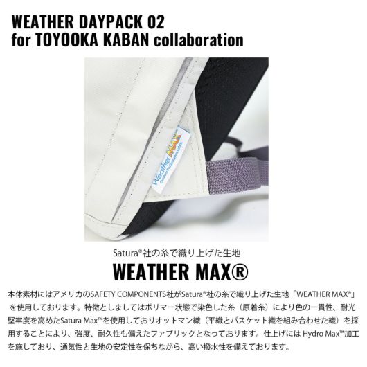 ポリマー状態で染色した糸(原着糸)により色の一貫性、耐光堅牢度を高めたSatura Max(TM)を使用しておりオットマン織(平織とバスケット織を組み合わせた織)を採用することにより、強度、耐久性も備えたファブリックとなっております。仕上げには Hydro Max(TM)加工を施しており、通気性と生地の安定性を保ちながら、高い撥水性を備えております。付属のキーホルダーとコラボレーションネームにはベジタブルタンニン鞣しのレザーに蓄光塗料を塗布する事により、昼間太陽の光を集める事により暗いところ等で発光する様になっております。