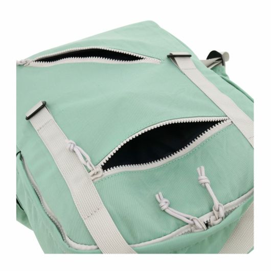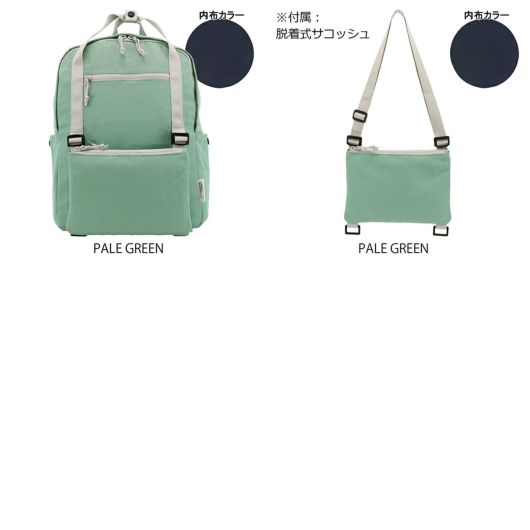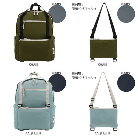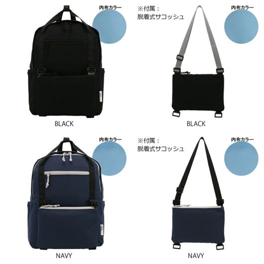 軽量で肌触りの良いナイロン生地を使用。ファスナーはビスロンファスナーを使用。シンプルなデザインと配色で、ビジネスやプライベートでも活躍します。取り外し可能なサコッシュを装備。