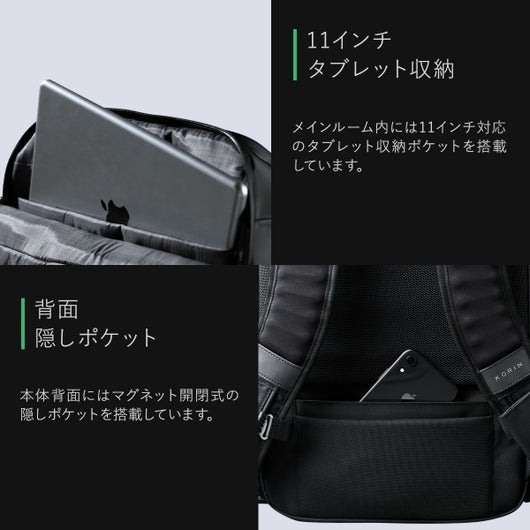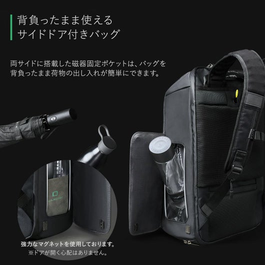 ・両サイドに搭載した磁器固定ポケットは、バッグを背負ったまま荷物の出し入れが簡単にできます。