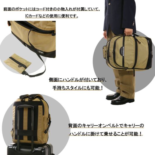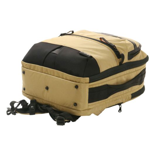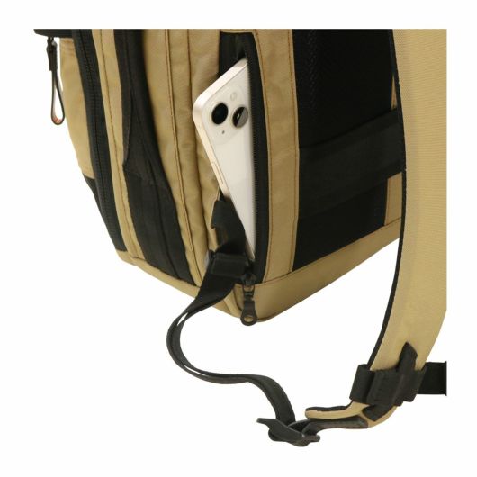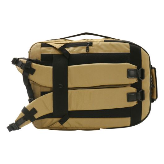 メインファブリックにはオリジナルマテリアルのMOONLIGHT FABRICを使用しています。縦横の糸に異なるカラーを使用することで光の反射や角度によって様々な表情を見せる素材になります。生地の裏面にはGBP加工を施すことで適度なハリ感と耐水性をUPさせております。付属のレザーは上質なイタリアンレザーを使用しファスナープルは2枚合わせでボンディング加工をするなど丁寧に仕上げております。高度な技術がいる立体的なパターンの組み合わせのより表現できる考えられたシルエットは使用したときにスッキリとした印象を与えてくれます。ガジェット対応ポケットや横持ちスタイル、キャリーバックにセットアップなど様々なシーンに対応できます。