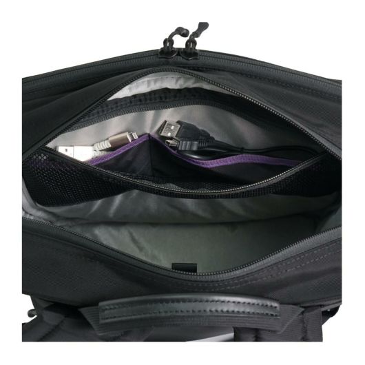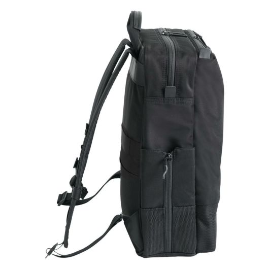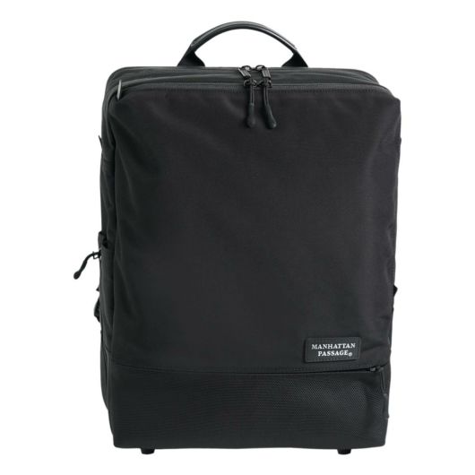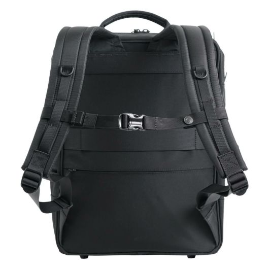 #5415より一回り小さいA4対応の軽量ビジネスリュック。前面に2種類の生地を使用したコンビネーションデザインモデル。前面と背面に折り畳み傘や小物を収納できるファスナーポケット。パッド入り背面ショルダーにはモバイルポーチなどを取り付けられるDリング付き。カバンの中を見やすくし、収納物を探しやすいシルバーの裏地を採用。軽量樹脂フレーム内蔵により形を綺麗に保てます。トローリーバッグにもセットアップ出来ます。